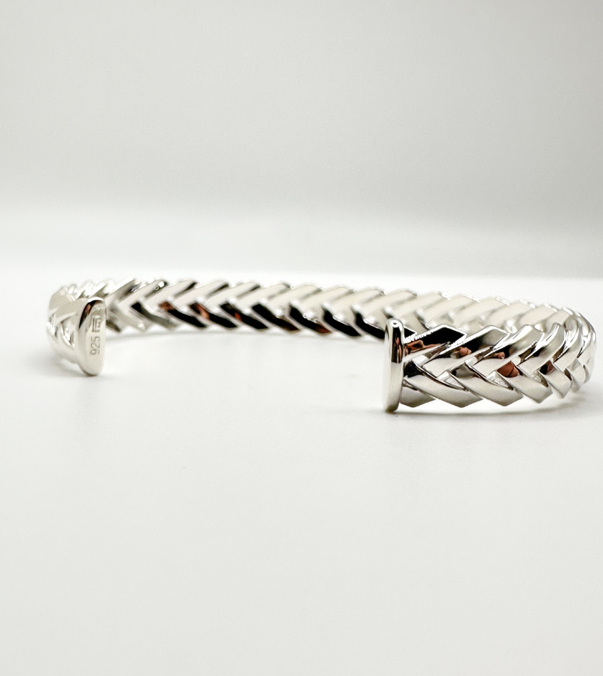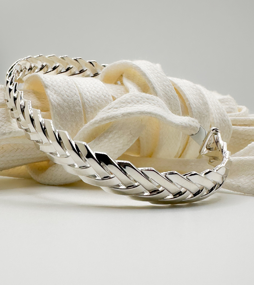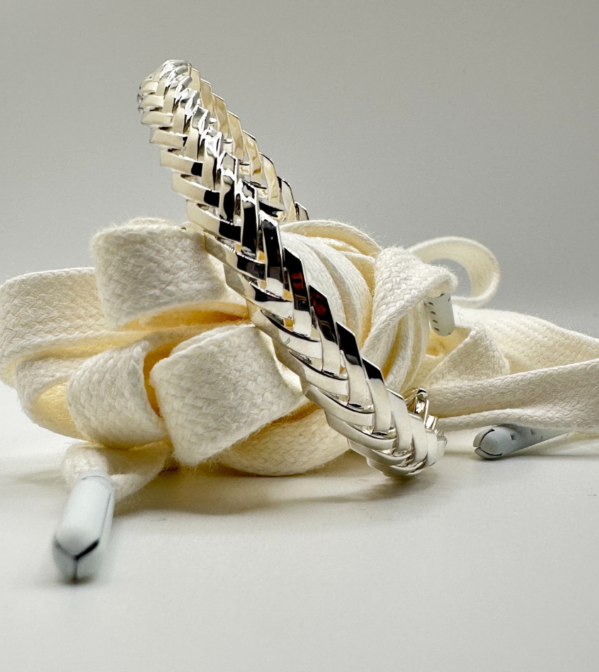 The fluidity of the chain-inspired pattern merges edgy industrial aesthetics with high-fashion refinement, making it the ultimate statement accessory. Its polished finish amplifies its versatility, whether you wear it solo for a minimalist edge or stack it to create a dramatic layered look.